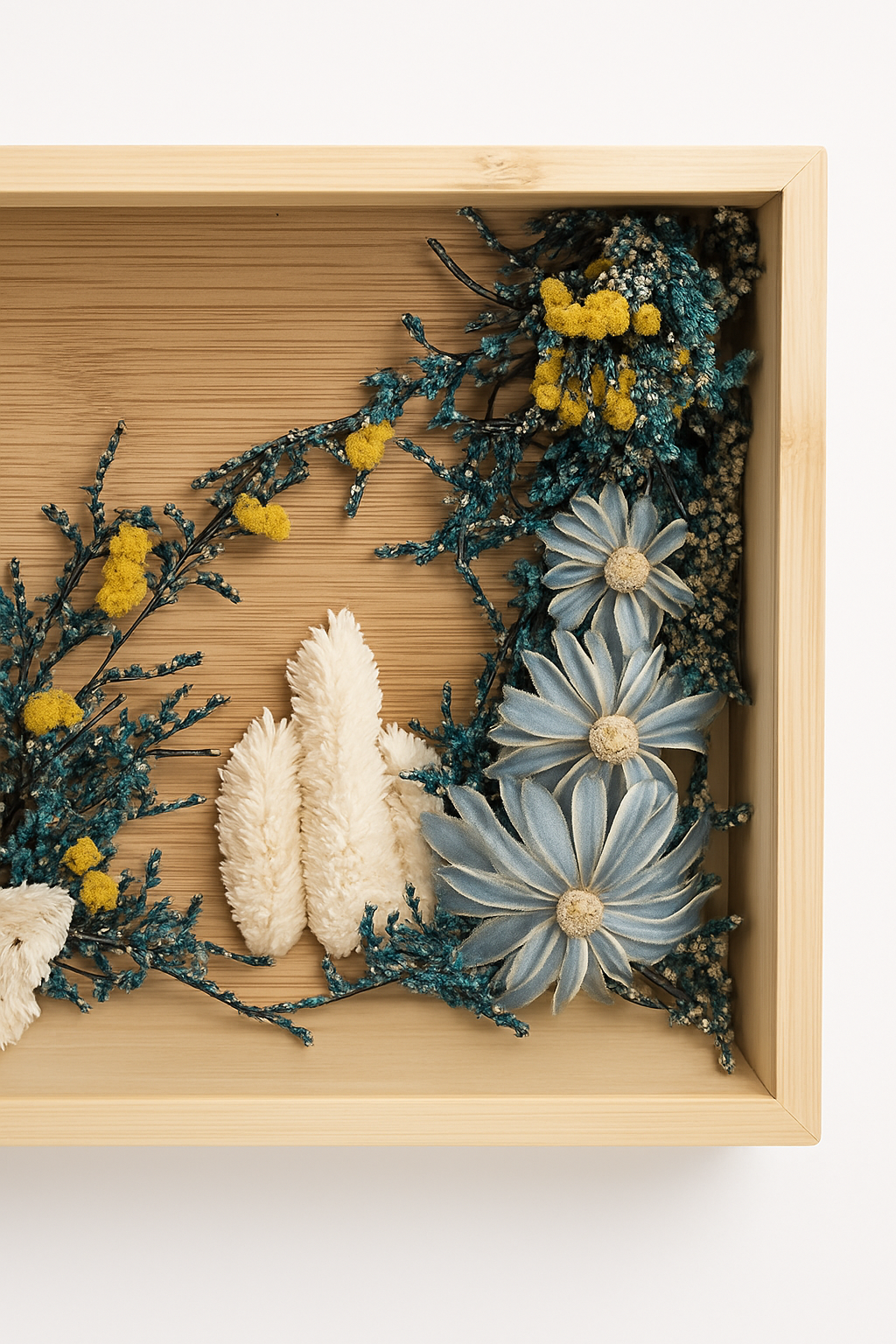Este exclusivo cuadro está elaborado a mano en una caja de madera natural y decorado con una composición única de flores secas preservadas:
