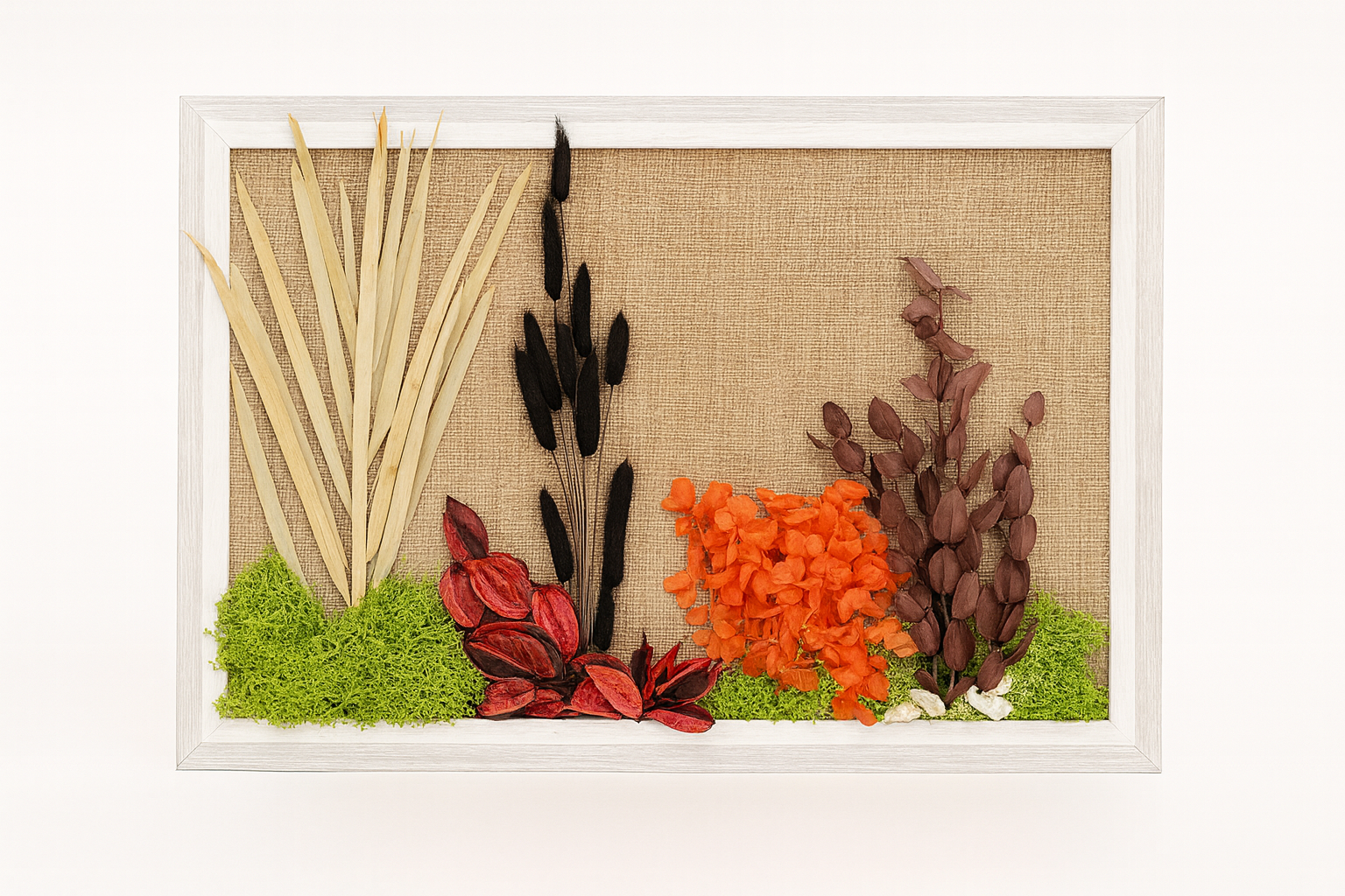 “Esther” es un cuadro natural lleno de carácter y contraste, diseñado para resaltar la belleza de los elementos orgánicos en su forma más pura. Sobre un fondo de yute neutro, se disponen armoniosamente hojas secas en tonos beige, flores y pétalos rojizos, espigas negras y follaje en matices terracota y verde musgo. Su marco blanco aporta equilibrio y luminosidad, creando una pieza elegante y contemporánea que combina fuerza y sutileza. Ideal para ambientes con estilo natural, moderno o boho.